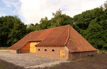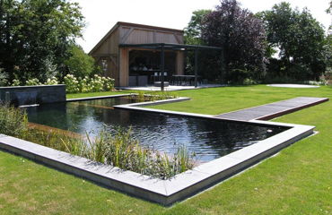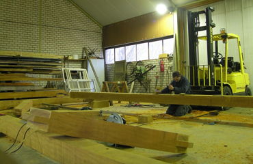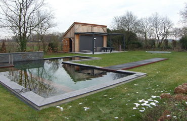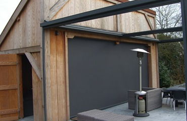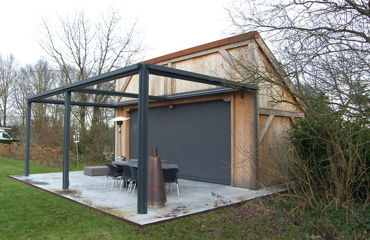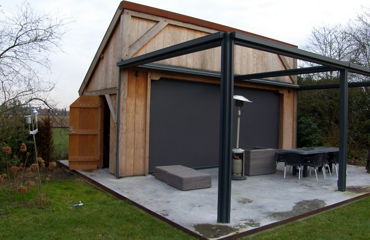 Dit bijgebouw is bedoeld als buitenkeuken. Om het gebouw een modern en strak uiterlijk te geven is er gekozen voor bilingahout. De brede planken zitten in een sponning verzonken. Hierdoor is de houtconstructie aan de binnen- en buitenkant zichtbaar.