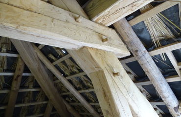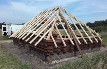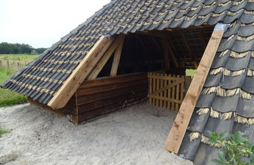 Onlangs bouwden wij deze schaapskooi bij de 'Philomenahoeve' in Nederweert-Eind. De schaapskooi werd op geheel traditionele wijze vervaardigd met gebruik van authentieke materialen. De spanten zijn vervaardigd uit eikenhout. Het dak is gedekt met een gebruikte oude holle pan. Onder deze pannen zijn stropoppen aangebracht.